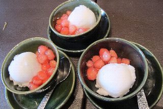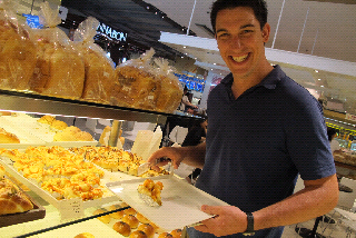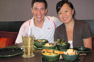 Amber: Our trip is definitely focused on trying new experiences and seeing new sights but some times it just seems to focus on food! We love the food here; be it is sticky rice with mango served on the street for breakfast (that while we ate we saw a rat crawl out of the gutter), or anything else you can find on Khaosan Road (spring rolls, pad thai, fried rice, fresh squeezed mandarin orange juice, and bbq or fried chicken legs to list a few we have tried) We went in search of MBK to look for a camera for Tim and got stuck at the food court at the mall next door and eating a variety of breads with an assortment of toppings, a pork and chicken on a skewer, toasted bread with powdered sugar and cinnamon, and then a very disappointing chicken Caesar wrap. We are craving bread! On our adventure of going to Chinatown we experienced fish balls (fish paste in a dough ball with a sweet spicy sauce) duck over noodles (actually amazing), won tons, bbq pork, fried bread with strawberry sauce, grilled prawns, and fresh pomegranate juice. Today we visited with Tim's friend Cindy back at the mall district by MBK and had a very elegant meal of Thai food. Cindy is an excellent host and the food we shared was amazing! We started with little crispy won tons, bbq chicken in banana leaves, a baked fish paste, tom yum soup with coconut milk, a refreshing lemon grass drink and continued on to sharing three entrees and finished with gelato and jelly covered water chestnuts. All very new to us but good just the same!
